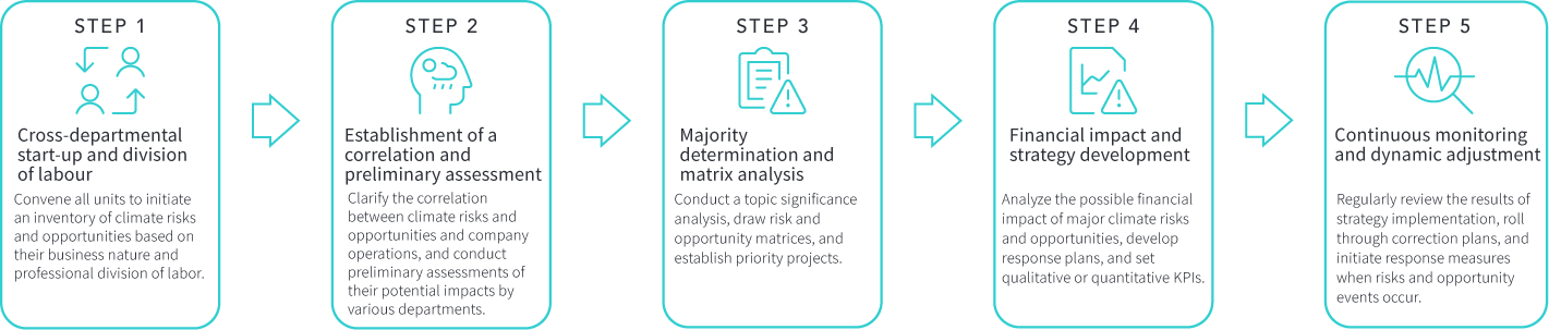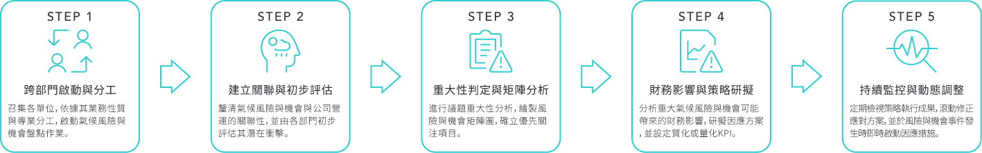 由永續長擔任召集人設立永續發展室及風險管理小組,小組組員由各單位最高主管、公司治理主管、稽核及法務等所組成,風險管理小組為負責執行風險管理之權責單位,定期彙整並提報公司風險管理執行情形報告。